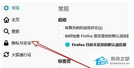 3、这时会进入火狐浏览器的选项页面,在页面左侧的菜单栏中点击切换到隐私与安全页面。