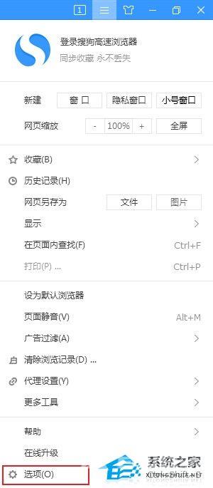 2、点击之后会在下方弹出搜狗浏览器的菜单窗口,在窗口最下方点击选项打开浏览器设置页面。