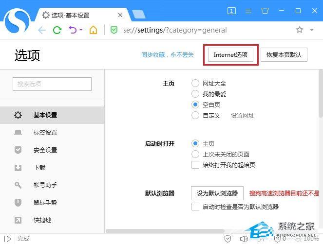3、此时会进入搜狗浏览器的设置页面中,在页面顶部可以看到internet 选项按钮,使用鼠标点击该按钮。