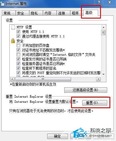 4、此时会弹出internet 属性窗口,在窗口头部点击切换到高级选项卡中,可以看到下面有个重置Internet explorer设置的选项,我们点击重置按钮。