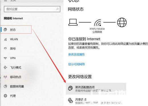 2、接着打开了网络和internet设置的窗口,此时选择的是左侧的状态,然后选择右侧的更改适配器选项。