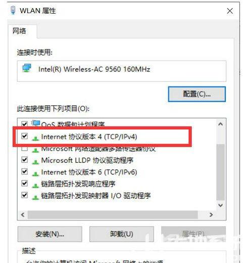 4、接着在WLAN属性的窗口中选择Internet协议版本4(TCP/IPv4),然后点击进入。