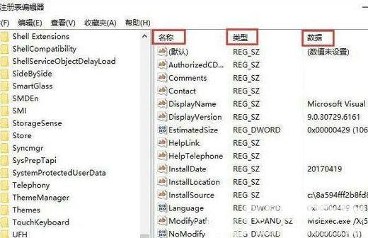 3、展开Uninstall文件夹,下可以看到名称、类型、数据,三项信息
