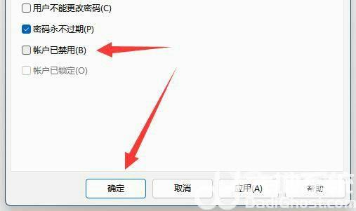 5、进去后取消帐户已禁用并确定,最终重启计算机就可正常的登录那一个账户了。
