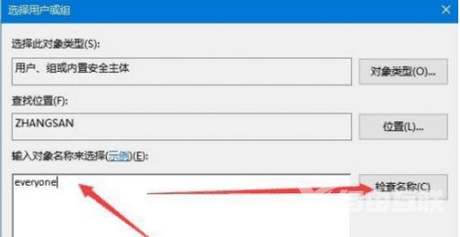 3,然后在打开选择用户或组窗口中输入每个人,然后单击检查名称按钮。