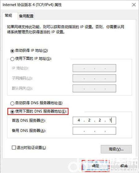 点击使用下面的DNS服务器地址,将首选DNS服务器修改为4.2.2.1或者4.2.2.2并点击确定,修改完毕之后我们就可以登录microsoft账户了。