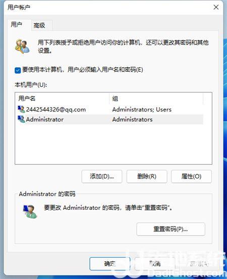 3、进入到用户帐户的选项窗口后,看下方选项要使用本计算机,用户必须输入用户名和密码前的方框,将√取消。