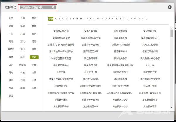 2、选择单位,涵盖全国各地院校, 你可以选择你的所在的城市省份,点击选择你的学校单位;