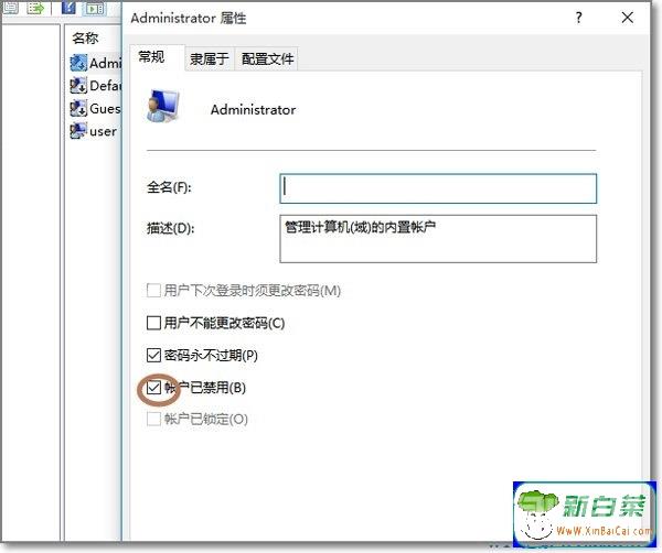 5、可以看到Administrator被禁用了,这是Win10为了保护系统安全,默认将Administrator禁用。