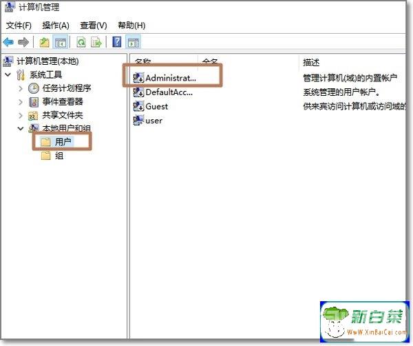 3、点击本地用户组-用户,在右侧可以看到Administrator用户与当前用户。