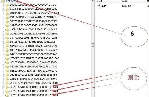 4、最后展开:HKEY_LOCAL_MACHINE\SOFTWARE\Classes\Installer\products ,在products 项下把7D2F3875100开头的项删除,由于键值有多个,我们找一下将所有7D2F3875100开头的都删除即可!