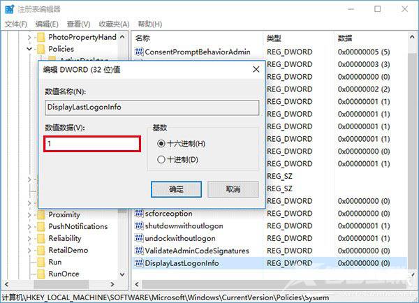 2、新建DWORD(32位)值(如上图),命名为DisplayLastLogonInfo,数值数据改为1即可,如下图;另外,如果本身就有该值的话,直接修改数值数据即可新白菜u盤啓動盤制作工具官網www.baicaipe.com