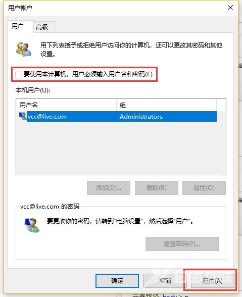 2、打开用户账户,取消要使用本计算机,用户必须输入用户名和密码的勾选,然后点击应用
