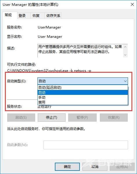 4、进入后,选择启动类型,把禁用改为自动,依次点击右下角的应用和确定,重启电脑,这样问题就解决了。