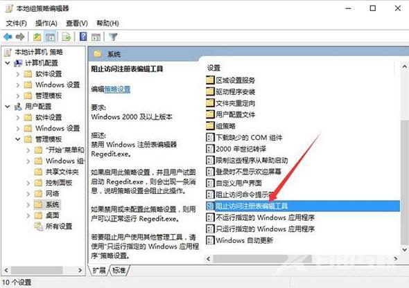 4、在系统选项右侧窗口,找到阻止访问注册表编辑工具选项选中,并双击鼠标左键将其打开。如图所示: