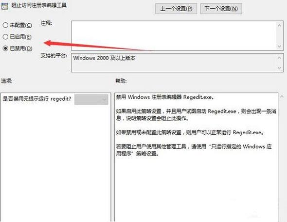 5、在阻止访问注册表编辑工具对话框中,将其设置更改为已禁用选项,然后在点击应用--》确定按钮退出即可。如图所示:
