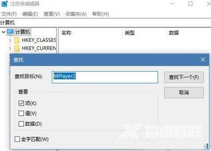 3、在查找输入框中,输入软件按名称,然后点击查找下一个 (一定要注意将项值数据全部勾选);