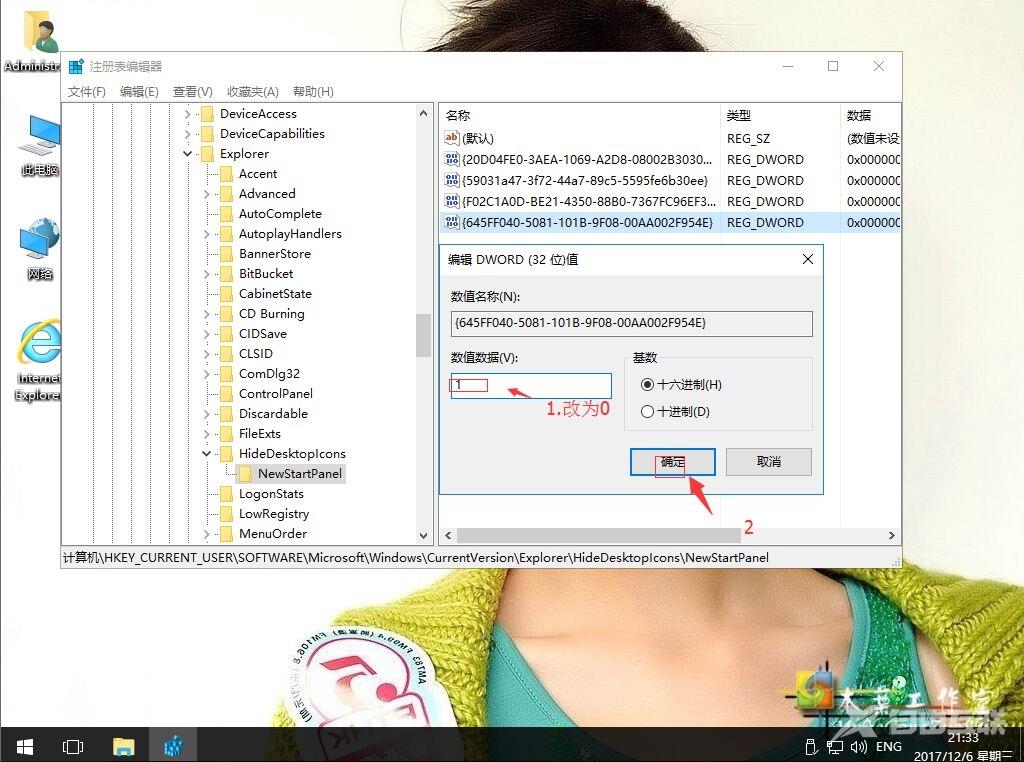 5、把数值改为0。再单击确定。然后电脑重启,回收站图标回来了。