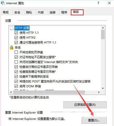 2、在internet属性界面,点击【高级】选卡,在下面点击【重置】按钮;