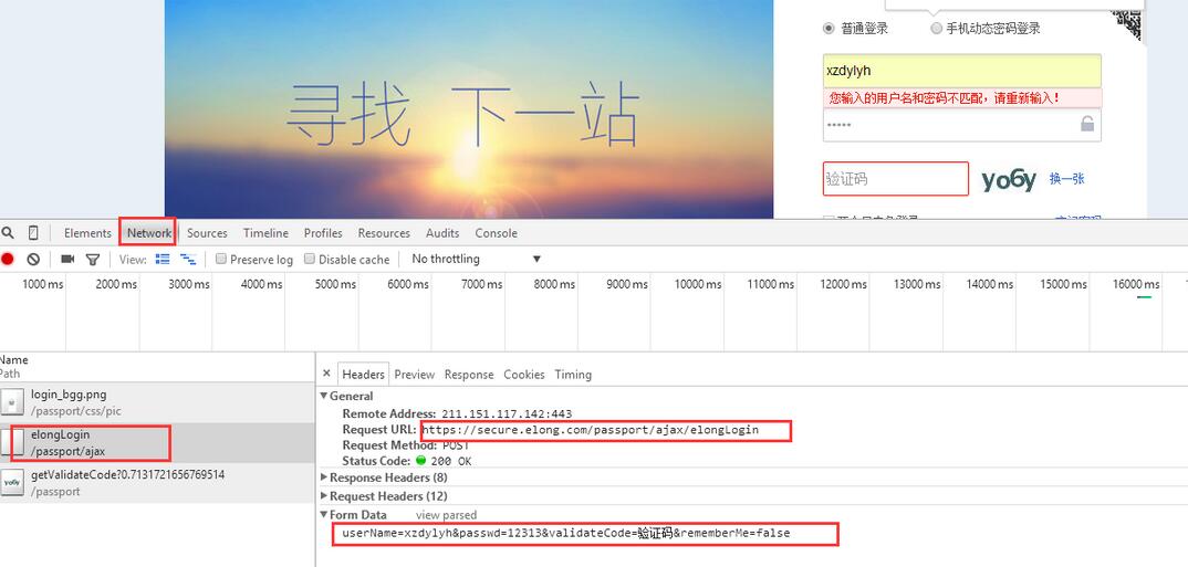模拟艺龙旅游网登录,供大家参考,具体内容如下 想模拟登录,首先整理一下流程 1.通过360浏览器(IE,火狐等等)F12开发人员工具抓到相关数据 2.获取验证码(拿到cookie),登录时也需要