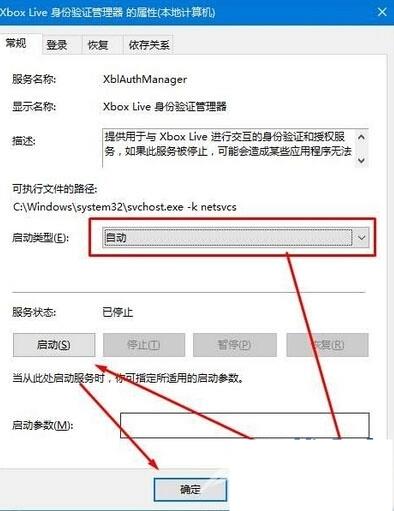 3.在Xbox Live 身份验证管理器属性中点击启动按钮,并将启动类型设置为自动,然后点击确定退出就可以了,如果还无法登录则重启电脑让设置生效。