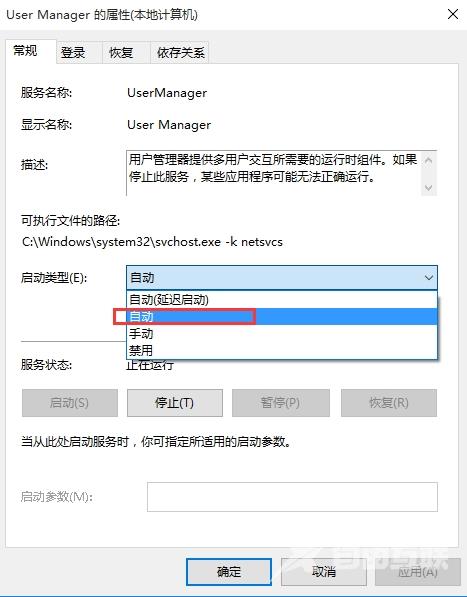 3.在User Manager服务属性界面中将其启动类型改为自动,若服务未启动则点击启动按钮,设置完毕后点击确定退出,之后重启电脑设置使生效就可以了。