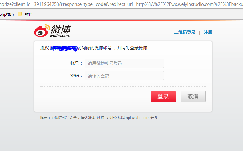 $wb_url = "https://api.weibo.com/oauth2/authorize?client_id={$key}&response_type=code&redirect_uri={$redirect_uri}";