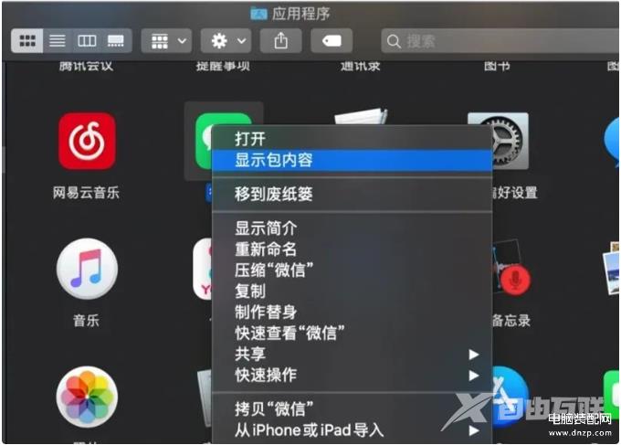 打开【应用程序】账号,找到【微信】并按下鼠标右键,选择【显示包内容】,然后依次点击【contents】-【MasOS】,使用鼠标右键按下【WeChat】,然后选择【制作替身】就可以了。