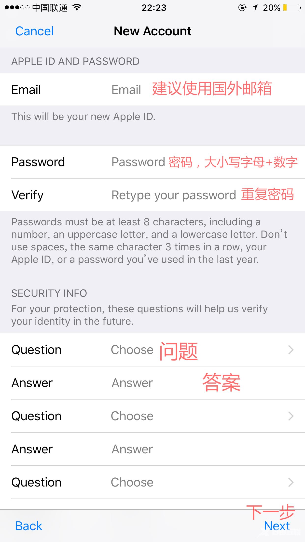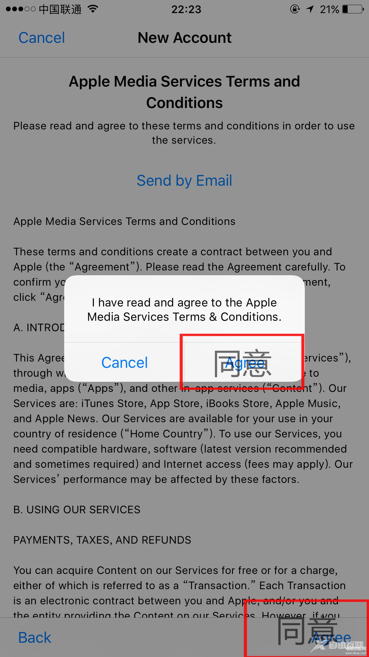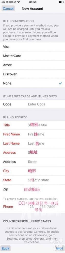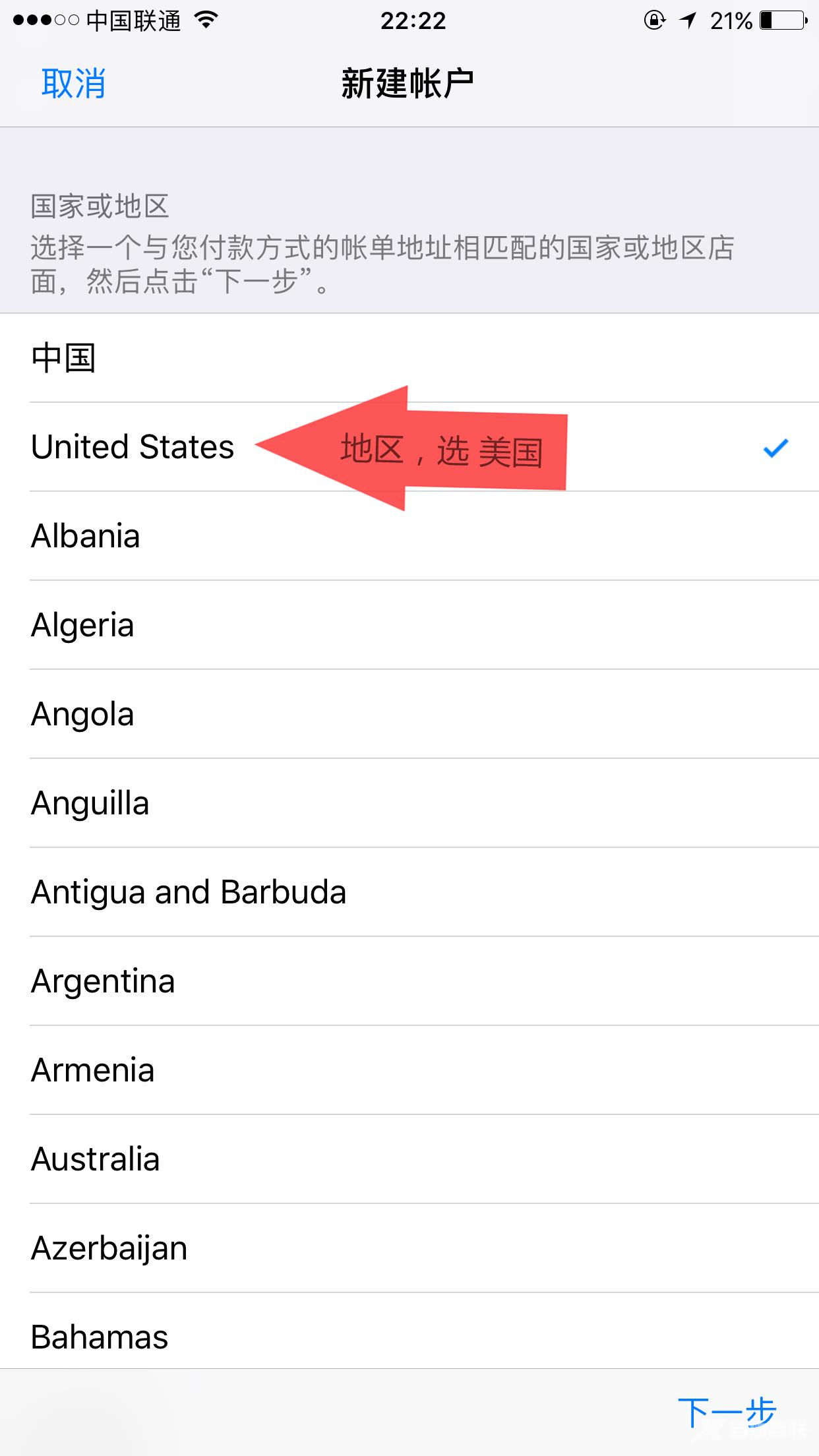(2).出现注册页面,地区选美国,Next,注册页面显示为英文,选择agree,图中红字部分是必填的,所有的信息填写均用英文。