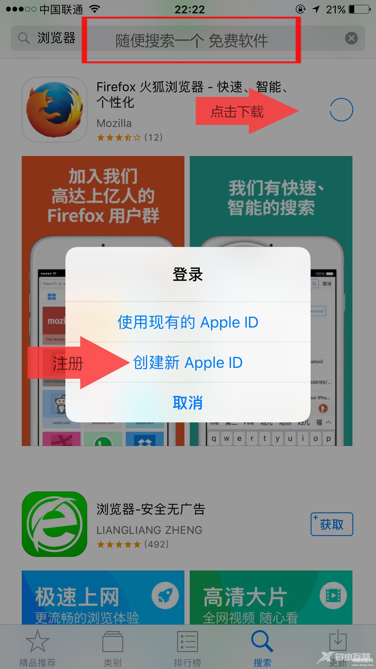 (1).打开app store,首页---划到最底部点击,appleID注销你原来的中国区账号,然后随便找一个(免费app):注意得是免费的!!!这样申请美国账号时,系统才不会让你填写银行卡信息,点击下载,由于你没有登陆账号,系统会提示你用现有AppleID登陆还是重新注册AppleID,这里点击“重新注册”。