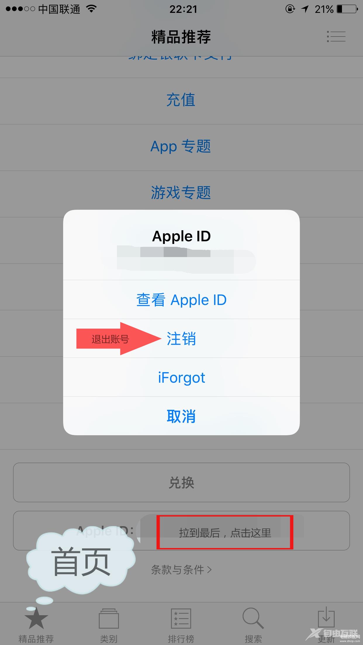 (1).打开app store,首页---划到最底部点击,appleID注销你原来的中国区账号,然后随便找一个(免费app):注意得是免费的!!!这样申请美国账号时,系统才不会让你填写银行卡信息,