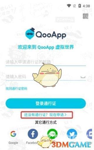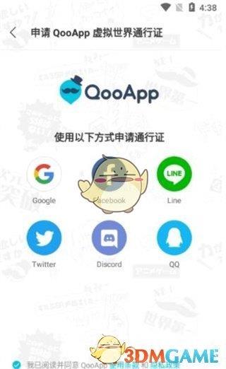 2、然后在申请Qoo App虚拟世界通行证的页面中,我们可以选择【Google、Facebook、Line、Twiter、Discord和QQ】等方式来注册;