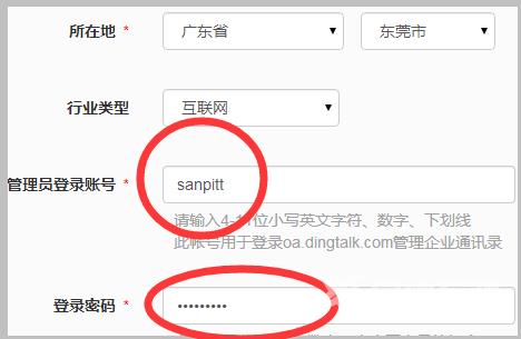 2、根据提示输入公司实际情况,并设置管理员登录账号和密码,该账号用户管理钉钉后台。