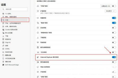 3、在导航菜单中再点击进入“外观”界面,把里面的“internet explorer 模式按钮”启用,这里在工具栏上就会显示一个带e按钮。