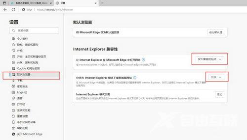 2、进入设置界面,在左侧的导航菜单中点击进入“默认浏览器”,在internet explorer 兼容性中两个选项,做如图设置。