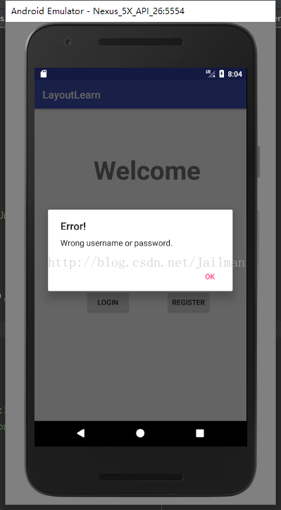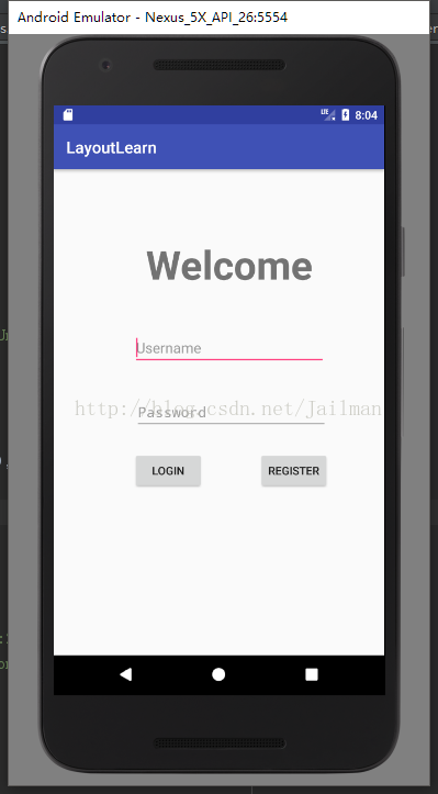 <?xml version="1.0" encoding="utf-8"?> <android.support.constraint.ConstraintLayout xmlns:android="http://schemas.android.com/apk/res/android" xmlns:app="http://schemas.android.com/apk/res-auto" xmlns:tools="http://schemas.android.com/tools" android:layout_width="match_parent" android:layout_height="match_parent" android:layout_centerVertical="true" tools:context="online.geekgalaxy.layoutlearn.MainActivity"> <Button android:id="@+id/button" android:layout_width="wrap_content" android:layout_height="wrap_content" android:layout_marginRight="68dp" android:text="@string/login" app:layout_constraintRight_toLeftOf="@+id/button2" tools:layout_constraintTop_creator="1" android:layout_marginEnd="68dp" android:layout_marginTop="26dp" app:layout_constraintTop_toBottomOf="@+id/editText2" /> <Button android:id="@+id/button2" android:layout_width="wrap_content" android:layout_height="wrap_content" android:text="@string/register" tools:layout_constraintTop_creator="1" tools:layout_constraintRight_creator="1" android:layout_marginEnd="68dp" app:layout_constraintRight_toRightOf="parent" android:layout_marginTop="26dp" app:layout_constraintTop_toBottomOf="@+id/editText2" /> <EditText android:id="@+id/editText" android:layout_width="240dp" android:layout_height="45dp" android:layout_marginBottom="35dp" android:layout_marginEnd="68dp" android:layout_marginLeft="8dp" android:layout_marginRight="8dp" android:layout_marginStart="68dp" android:ems="10" android:hint="@string/username" android:inputType="textPersonName" app:layout_constraintBottom_toTopOf="@+id/editText2" app:layout_constraintHorizontal_bias="0.516" app:layout_constraintLeft_toLeftOf="@+id/editText2" app:layout_constraintRight_toRightOf="@+id/editText2" tools:layout_constraintLeft_creator="1" tools:layout_constraintRight_creator="1" tools:layout_editor_absoluteX="-15dp" tools:layout_editor_absoluteY="152dp" /> <EditText android:id="@+id/editText2" android:layout_width="240dp" android:layout_height="45dp" android:layout_marginEnd="69dp" android:layout_marginLeft="0dp" android:layout_marginRight="0dp" android:layout_marginStart="69dp" android:ems="10" android:hint="@string/password" android:inputType="textPassword" app:layout_constraintBottom_toBottomOf="parent" app:layout_constraintLeft_toLeftOf="@+id/button" app:layout_constraintRight_toRightOf="@+id/button2" app:layout_constraintTop_toTopOf="parent" tools:layout_constraintBottom_creator="1" tools:layout_constraintLeft_creator="1" tools:layout_constraintRight_creator="1" tools:layout_constraintTop_creator="1" /> <TextView android:id="@+id/textView2" android:layout_width="250dp" android:layout_height="65dp" android:layout_marginBottom="50dp" android:layout_marginLeft="8dp" android:layout_marginRight="8dp" android:autoText="false" android:text="Welcome" android:textAlignment="center" android:textSize="50sp" android:textStyle="bold" app:layout_constraintBottom_toTopOf="@+id/editText" app:layout_constraintHorizontal_bias="0.509" app:layout_constraintLeft_toLeftOf="@+id/editText" app:layout_constraintRight_toRightOf="@+id/editText" /> </android.support.constraint.ConstraintLayout>