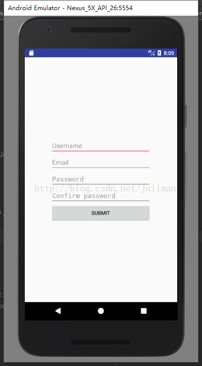 <?xml version="1.0" encoding="utf-8"?> <LinearLayout xmlns:android="http://schemas.android.com/apk/res/android" android:layout_width="match_parent" android:layout_height="match_parent"> <LinearLayout android:layout_width="match_parent" android:layout_height="match_parent" android:gravity="center_vertical|center_horizontal" android:orientation="vertical"> <EditText android:id="@+id/editText5" android:layout_width="270dp" android:layout_height="wrap_content" android:ems="10" android:hint="Username" android:inputType="textPersonName" /> <EditText android:id="@+id/editText6" android:layout_width="270dp" android:layout_height="wrap_content" android:ems="10" android:hint="Email" android:inputType="textPersonName" /> <EditText android:id="@+id/editText7" android:layout_width="270dp" android:layout_height="wrap_content" android:ems="10" android:hint="Password" android:inputType="textPassword" /> <EditText android:id="@+id/editText8" android:layout_width="270dp" android:layout_height="wrap_content" android:ems="10" android:hint="Confirm password" android:inputType="textPassword" /> <Button android:id="@+id/button3" android:layout_width="270dp" android:layout_height="wrap_content" android:text="Submit" /> </LinearLayout> </LinearLayout>