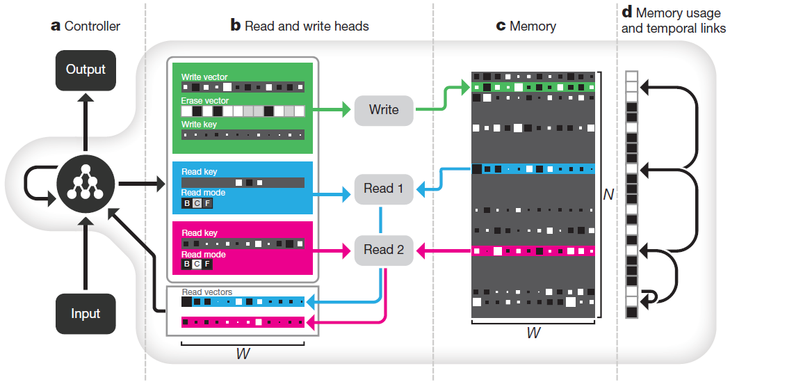 共同一作: Alex Graves1*, Greg Wayne1* DNC 早期版本: neural Turing machine 比较: 内存访问方法上有限制(limited) a DNC uses differentiable attention mechanisms to define distributions over the N rows, or ‘locations’