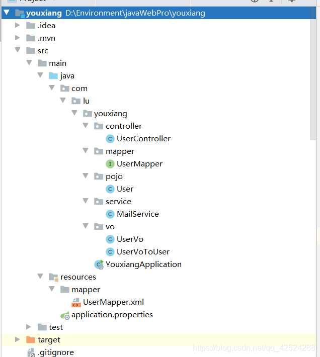 如最上边的项目结构图。controller包是和前端对接的,mapper包中是接口,pojo是实体类,service层是逻辑代码,vo包是前端发送数据暂时保存。