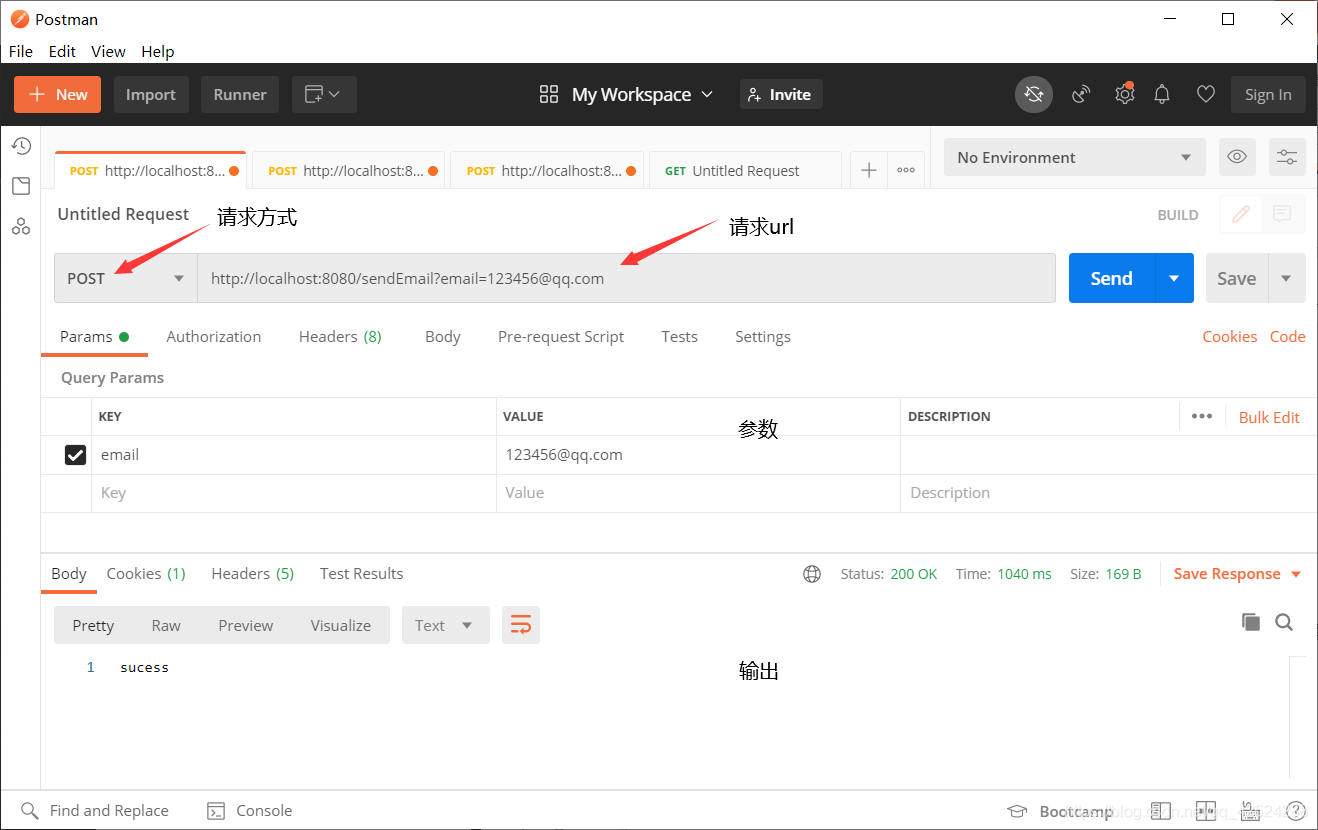把请求url复制到如下如的url中, 邮箱换成自己的,请求方式换成POST。点击send。