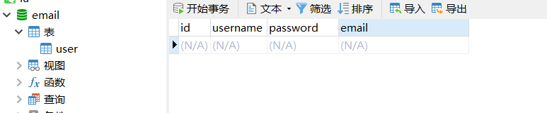 CREATE TABLE `user` ( `id` int(20) NOT NULL AUTO_INCREMENT, `username` varchar(255) NOT NULL, `password` varchar(255) NOT NULL, `email` varchar(255) NOT NULL, PRIMARY KEY (`id`) ) ENGINE=InnoDB AUTO_INCREMENT=6 DEFAULT CHARSET=utf8;